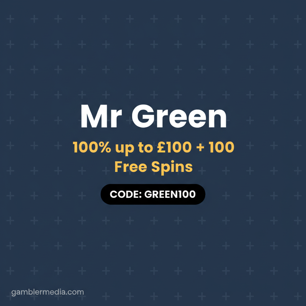 The Mr Green bonus code is GREEN100. Enter this code in the bonus code field during registration to unlock the 100% up to £100 + 100 Free Spins welcome offer. No separate activation required – your bonus will be credited automatically upon qualifying deposit.